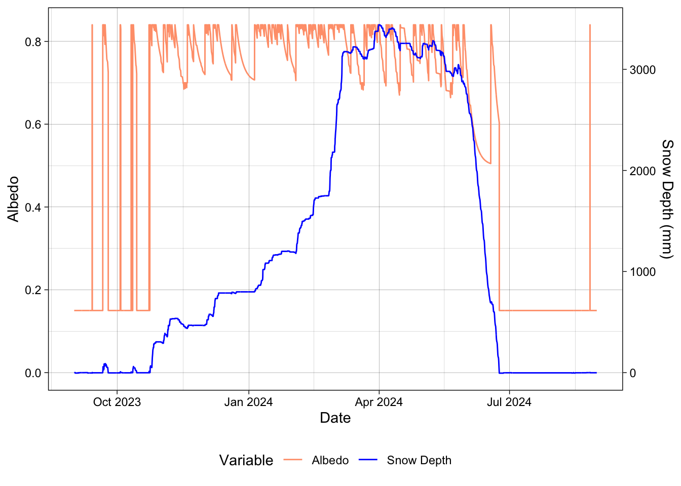 scale_color_manual(values = c("Albedo" = "#FFA07A", "Snow Depth" = "blue")) +