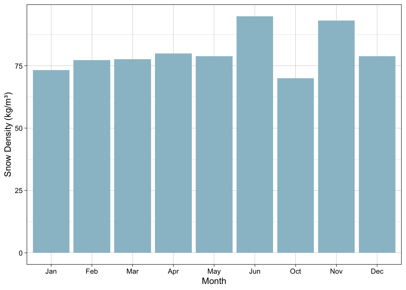Figure 1. Bar plot showing snow densities in kg/m3 for Yellowstone national park ASOS data.