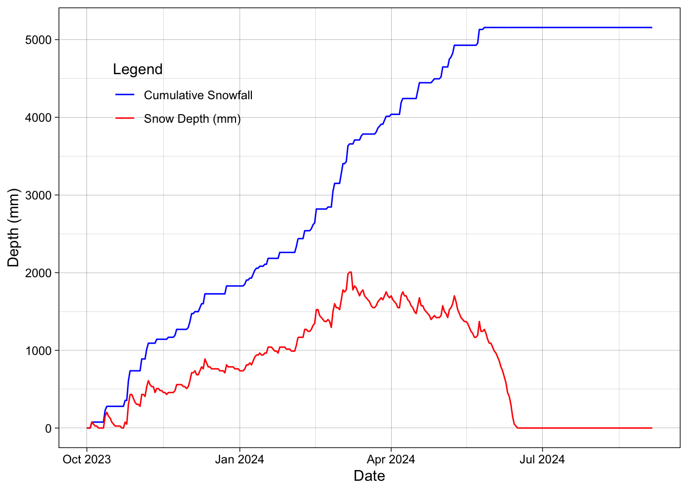 geom_line(aes(y = cumm_snowdepth, color = "Cumulative Snowfall")) +