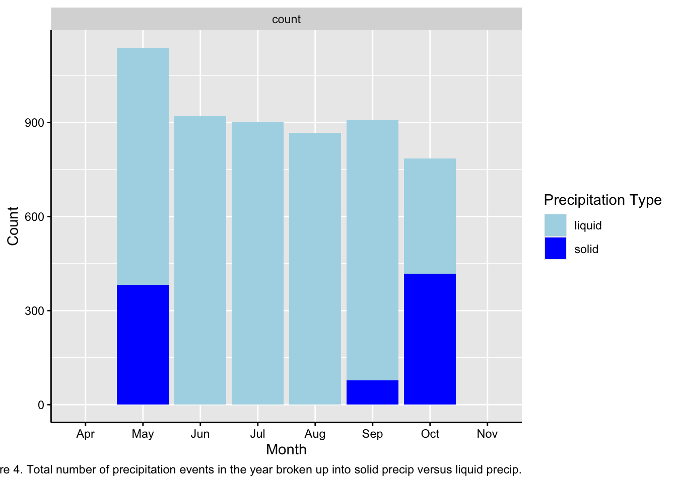 caption = " Figure 4. Total number of precipitation events in the year broken up into solid precip versus liquid precip."