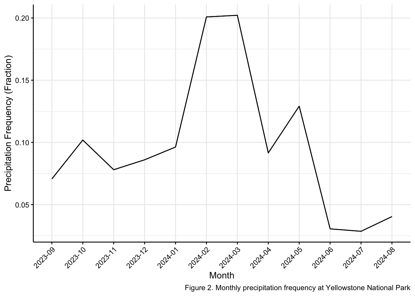 caption = "Figure 2. Monthly precipitation frequency at Yellowstone National Park") +