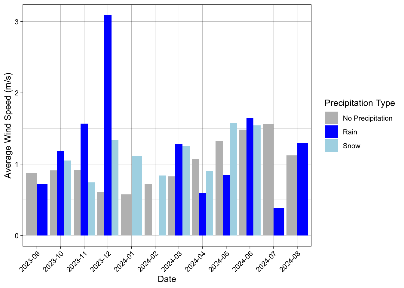 Compare the monthly average wind speed during rainfall events, snowfall events, and when no precipitation is occurring. Use a 0oC air temperature threshold to distinguish between rain and snow.