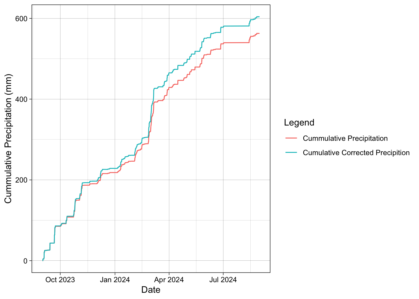 | ASOS_yellowstone_CR_clean %>% ggplot()+ geom_line(aes(x = valid, y = cummulative_precip_mm, color = “Cummulative Precipitation”))+ geom_line(aes(x = valid, y = cummulative_corr_precip_mm, color = “Cumulative Corrected Precipition”))+ labs( x = “Date”, y = “Cummulative Precipitation (mm)”, color = “Legend” )+ theme_linedraw() ``` |
