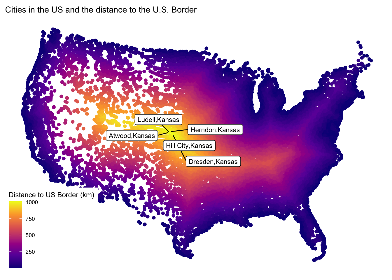 labs(title = "Cities in the US and the distance to the U.S. Border")