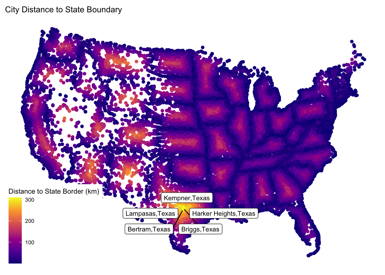 geom_sf(data = city_location_sp, aes(color = dist_state_border_km))+