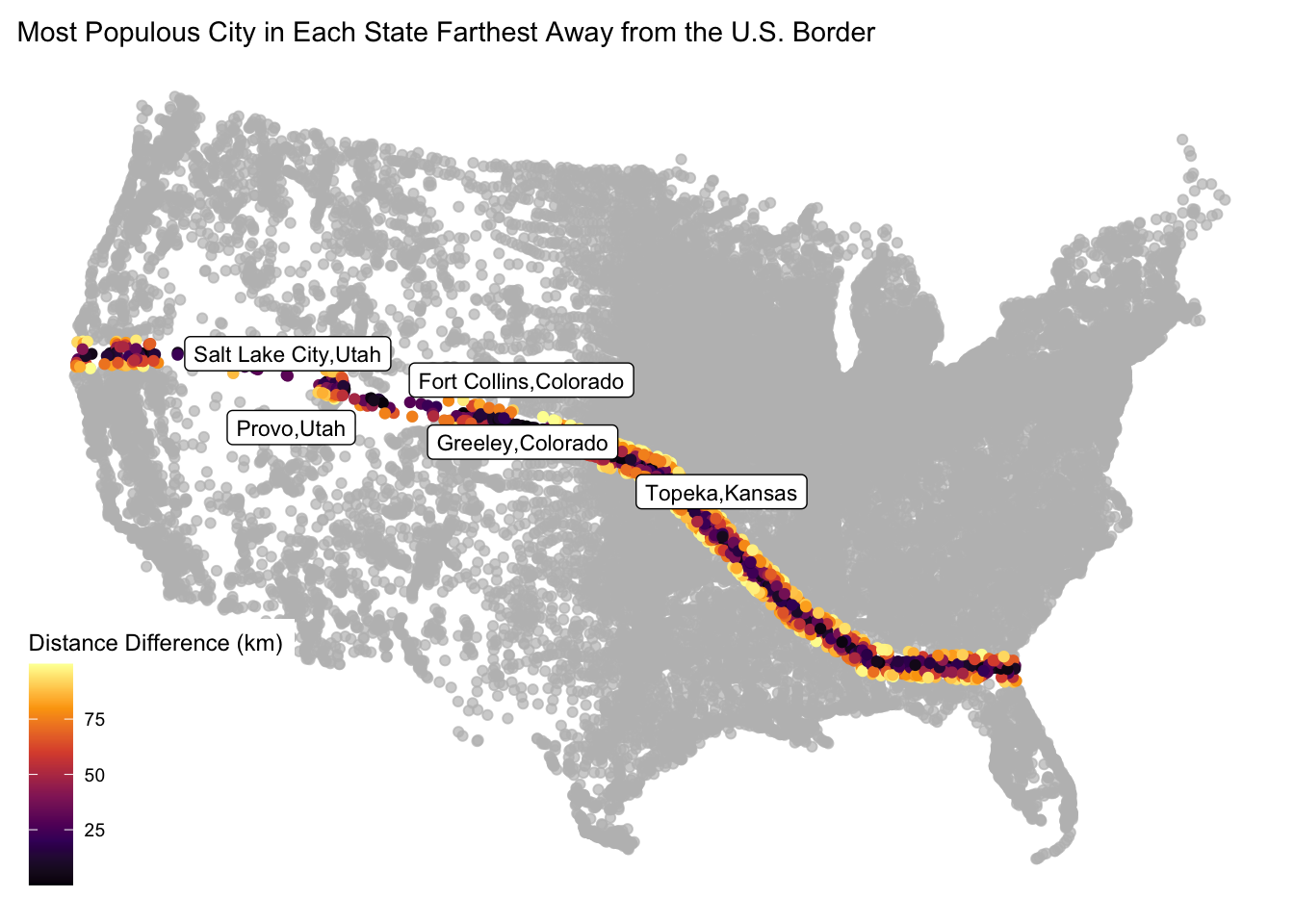 labs(title = "Most Populous City in Each State Farthest Away from the U.S. Border")
