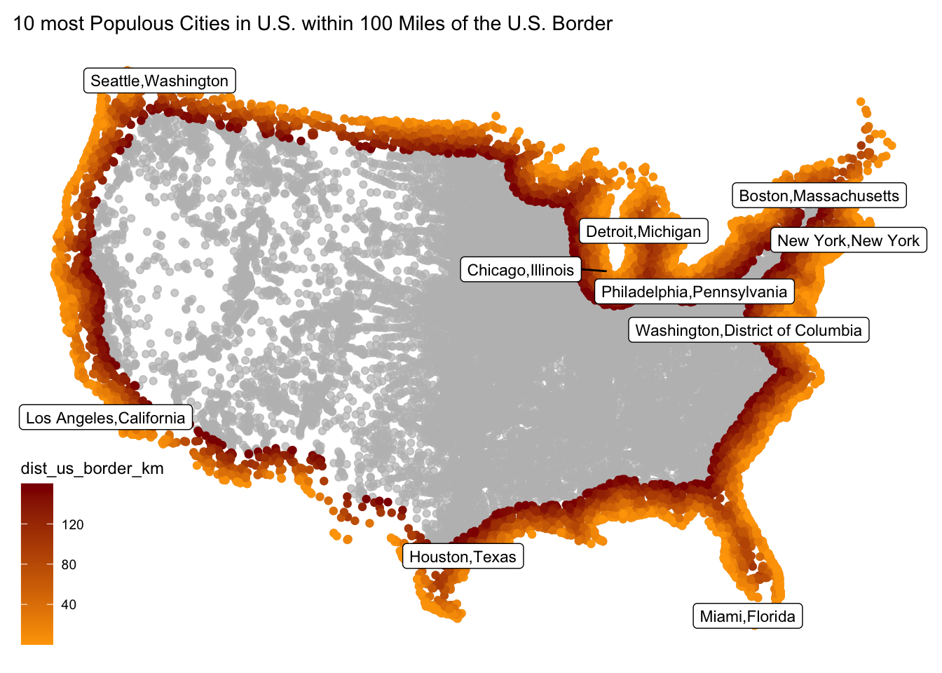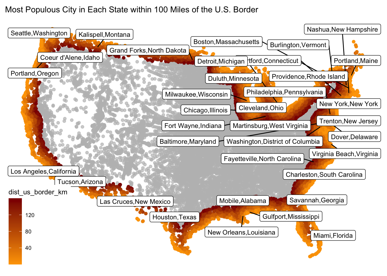 labs(title = "Most Populous City in Each State within 100 Miles of the U.S. Border")