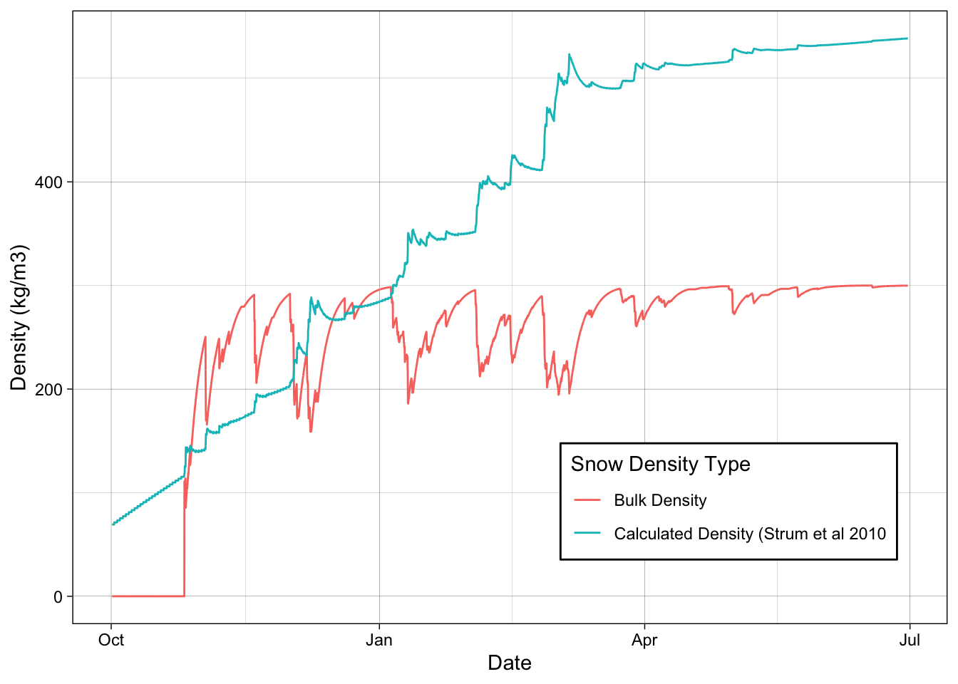 psmax <-597.5ps0 <-223.7k1 <-0.0012k2 <-0.0038ASOS_snow_calcs <- ASOS_snow_calcs %>%mutate(day_of_year =yday(valid)) %>%mutate(day_of_year =ifelse(day_of_year >273, day_of_year -365, day_of_year))# StrumASOS_snow_calcs <- ASOS_snow_calcs %>%mutate(strum_density = (psmax - ps0)*(1-exp(-k1 * total_snow_depth - k2 * day_of_year)) + ps0)ggplot()+geom_line(data = ASOS_snow_calcs, aes(x = valid, y = combined_density, color ="Bulk Density"))+geom_line(data = ASOS_snow_calcs, aes(x = valid, y = strum_density, color ="Calculated Density (Strum et al 2010"))+labs(color ="Snow Density Type",y ="Density (kg/m3)",x ="Date" )+theme_linedraw()+theme(legend.position =c(0.75,0.20),legend.background =element_rect(fill ="white", color ="black"))