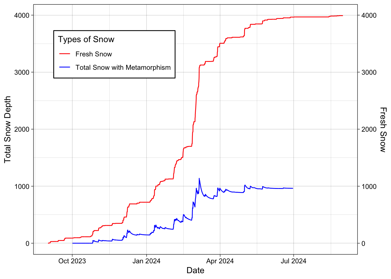 ggplot() +geom_line(data = ASOS_snow_calcs, aes(x = valid, y = total_snow_depth, color ="Total Snow with Metamorphism")) +geom_line(data = ASOS_accumulation_new, aes(x = valid, y =cumsum(snowfall), color ="Fresh Snow")) +scale_y_continuous(name ="Total Snow Depth",sec.axis =sec_axis(~., name ="Fresh Snow") ) +scale_color_manual(values =c("Total Snow with Metamorphism"="blue", "Fresh Snow"="red")) +labs(x ="Date",color ="Types of Snow" ) +theme_linedraw()+theme(legend.position =c(0.25,0.80),legend.background =element_rect(fill ="white", color ="black"))
