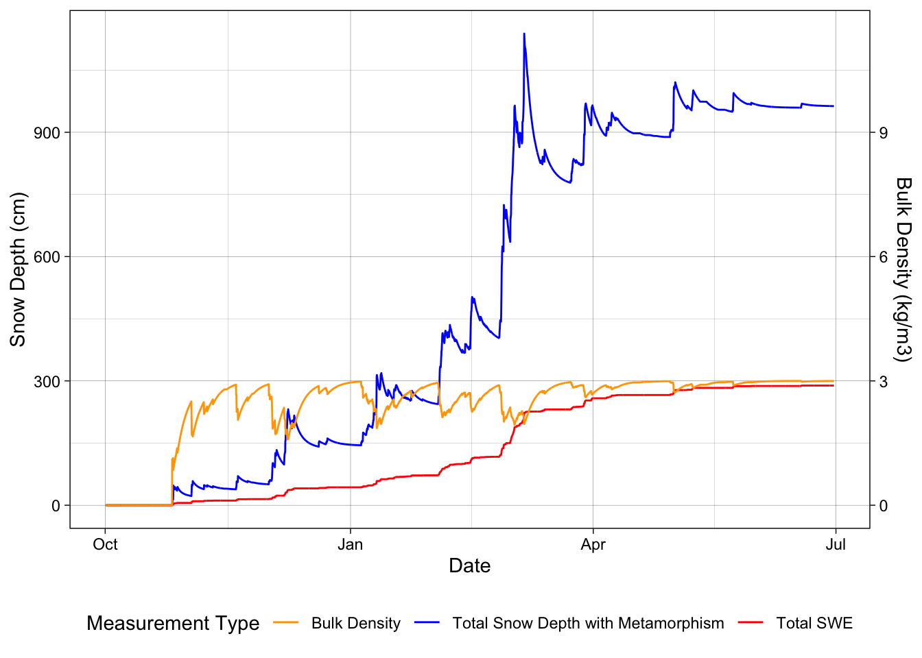 ggplot() +geom_line(data = ASOS_snow_calcs, aes(x = valid, y = total_snow_depth, color ="Total Snow Depth with Metamorphism")) +geom_line(data = ASOS_snow_calcs, aes(x = valid, y = total_swe, color ="Total SWE")) +geom_line(data = ASOS_snow_calcs,aes(x = valid, y = combined_density, color ="Bulk Density")) +scale_y_continuous(name ="Snow Depth (cm)",sec.axis =sec_axis(~./100, name ="Bulk Density (kg/m3)") ) +scale_color_manual(values =c("Total Snow Depth with Metamorphism"="blue", "Total SWE"="red", "Bulk Density"="orange") ) +labs(x ="Date",color ="Measurement Type" ) +theme_linedraw() +theme(legend.position ="bottom")